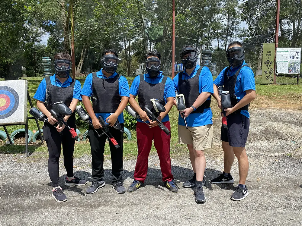 Everyone geared up and ready for paintball!